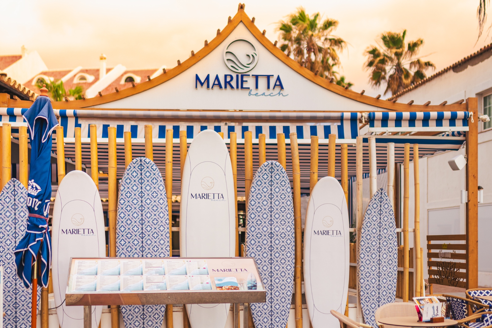 Marietta Beach Restaurant se encuentra en un enclave privilegiado frente al mar, en plena Playa de las Américas, uno de los destinos más vibrantes del sur de Tenerife. Su diseño combina madera, tonos mediterráneos y una estética elegante que transmite relax, cercanía y esencia costera. La terraza abierta, rodeada de palmeras y bañada por la brisa del Atlántico, crea el ambiente perfecto para desayunar, almorzar o cenar junto al océano. Un espacio acogedor y luminoso, pensado para disfrutar sin prisas y dejar que el entorno haga el resto.